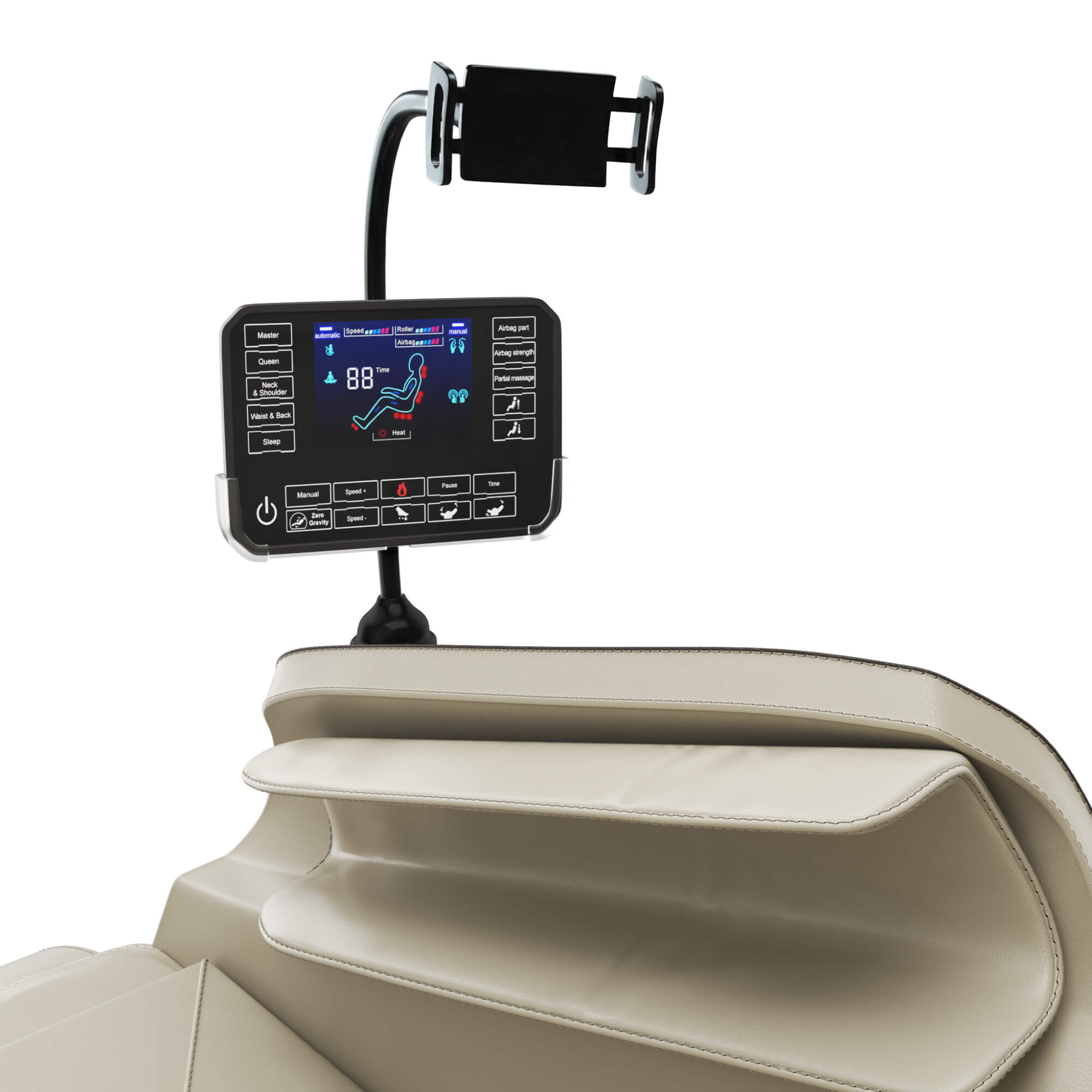 - Управляйте с легкостью! Интуитивно понятный сенсорный пульт управления в виде планшета располагается на подлокотнике. Кресло оборудовано гибким держателем для смартфона, он надежно фиксирует телефон, обеспечивая максимальный комфорт. Массажное кресло оснащено поворотным переключателем для управления программами массажа. При необходимости в меню можно настроить подогрев, скорость, время. Широкий диапазон изменения уровня давления и времени поможет настроить массажный механизм под свои потребности.