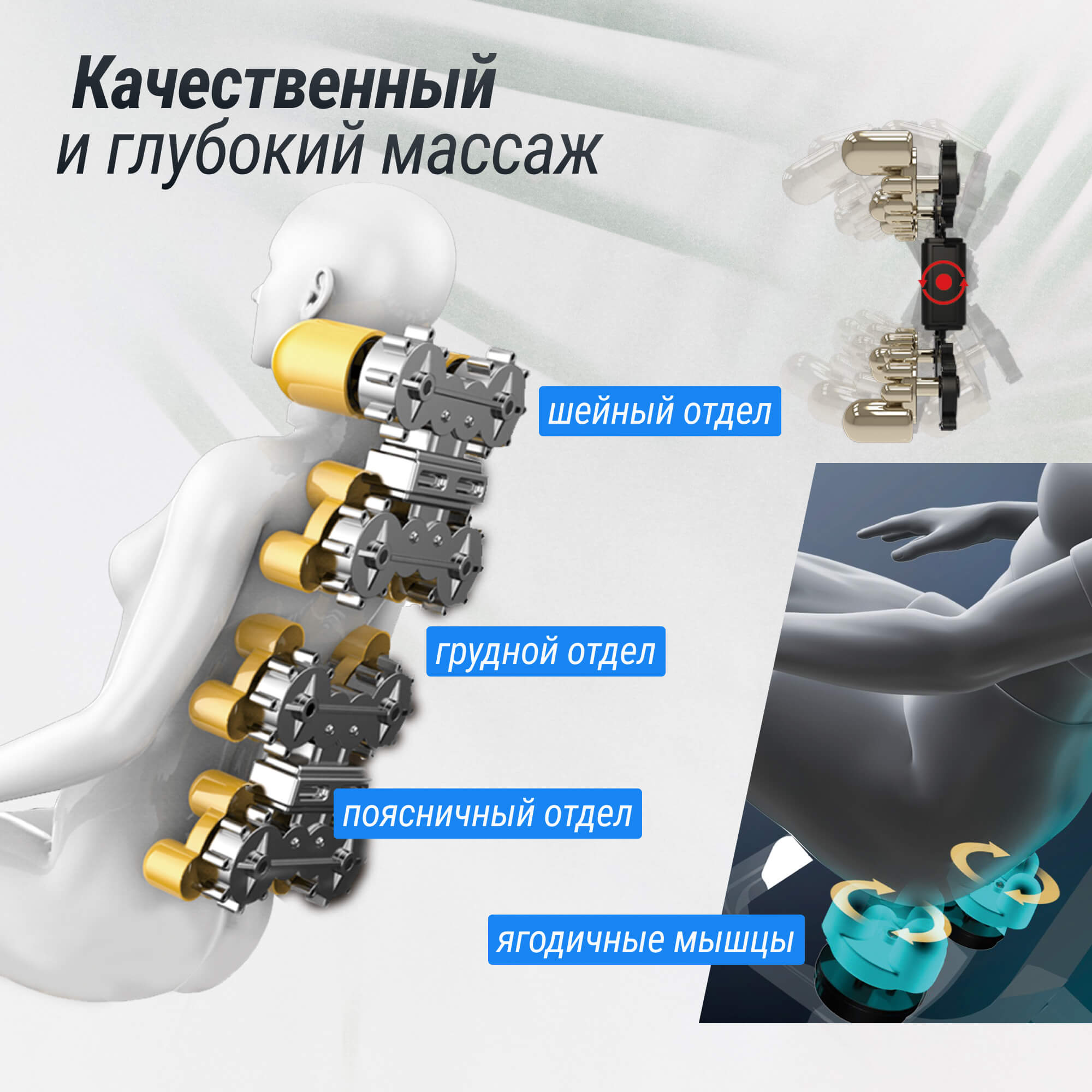 Электрическое массажное кресло оснащено инновационными воздушными подушками и нажимными массажными головками, которые обеспечивают глубокий и расслабляющий массаж всего тела. Воздушные подушки мягко обнимают ваше тело, создавая эффект легкого давления, который помогает снять напряжение и улучшить кровообращение. Восемь нажимных массажных головок прорабатывают самые проблемные зоны на спине, обеспечивая целенаправленное воздействие на напряженные мышцы.