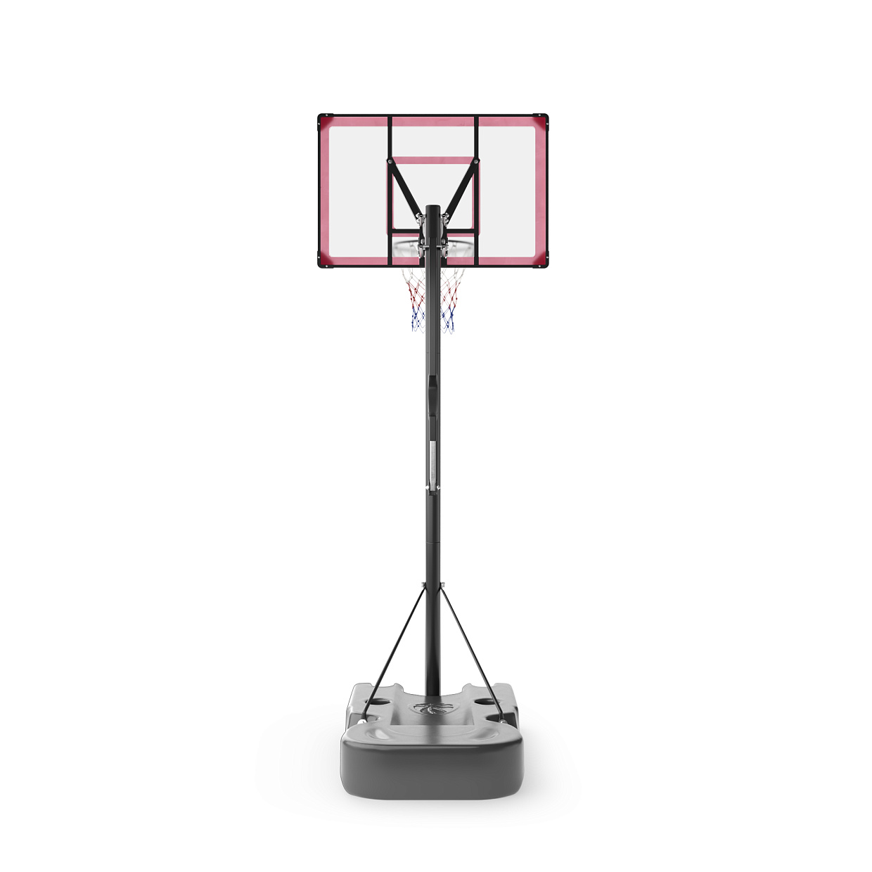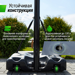 Такие высококачественные материалы уличной баскетбольной стойки 305 см как всепогодная нейлоновая сетка, щит из поликарбоната толщиной 2 мм, стальные трубы стойки и водоналивное основание платформы до 130 л гарантируют долгий срок службы, устойчивость к погодным условиям и главное - безопасность. Водоналивную платформу можно заполнить песком для большей устойчивости. Простая сборка и возможность перемещения стойки на двух колесах, обеспечат комфорт даже при подготовке к игре. Рекомендуется следить за количеством заполнителя в основании, чтобы сохранять устойчивость в безопасном режиме во время занятий баскетболом.
