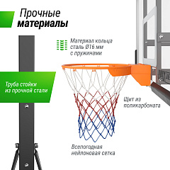 Такие высококачественные материалы уличной баскетбольной стойки 305 см как всепогодная нейлоновая сетка, щит из поликарбоната толщиной 3 мм, стальные трубы стойки и металлическое основание с противовесом гарантируют долгий срок службы, устойчивость к погодным условиям и главное - безопасность. Простая сборка и возможность перемещения стойки на двух колесах, обеспечат комфорт даже при подготовке к игре.