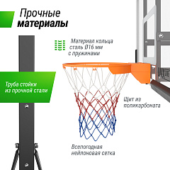 Такие высококачественные материалы уличной баскетбольной стойки 305 см как всепогодная нейлоновая сетка, щит из поликарбоната с защитной пленкой толщиной 3 мм, стальные трубы стойки и водоналивное основание платформы до 180 л гарантируют долгий срок службы, устойчивость к погодным условиям и главное - безопасность. Водоналивную платформу можно заполнить песком для большей устойчивости. Простая сборка и возможность перемещения стойки на двух колесах, обеспечат комфорт даже при подготовке к игре.