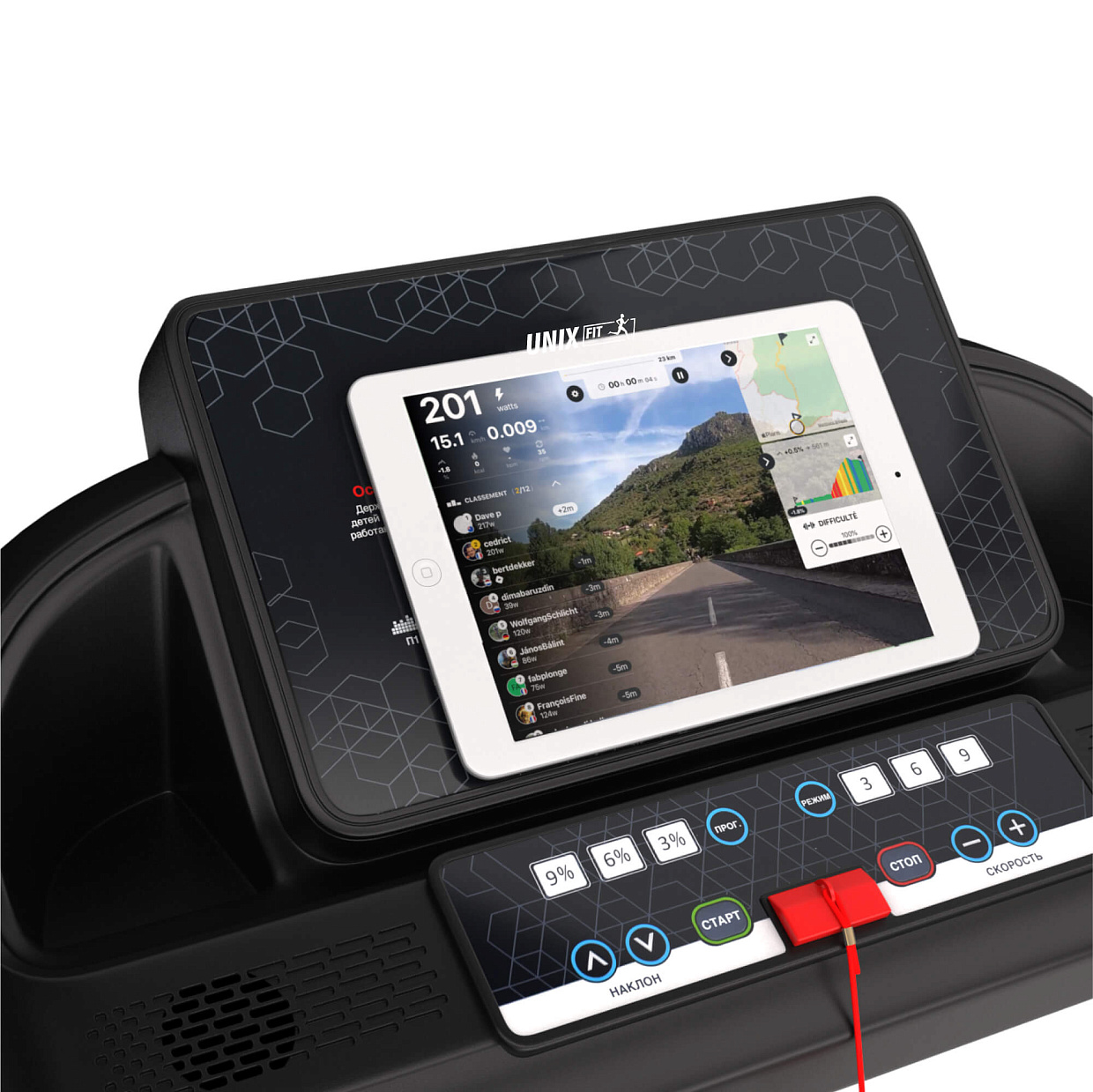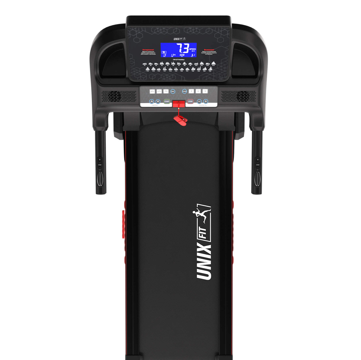 | Измерение пульса | сенсорные датчики на поручнях, возможность подключения беспроводного кардиодатчика UNIXFIT |
