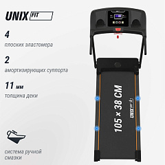 Беговую дорожку UNIX Fit ST-330 можно убрать под диван или за дверь. Двухслойное беговое полотно (38*105 см) оптимально подходит для умеренных физических нагрузок, максимальная скорость бега составляет 8,5 км/ч.