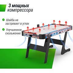 Благодаря трем мощным вентиляторам, игровая поверхность большого аэрохоккея обеспечивает плавное и безупречное движение игровых дисков, добавляя реалистичности и скорости в игру. В комплект входят 2 шайбы и 2 биты из ABS-пластика. Размер шайб и бит 60 мм. Стол дополнительно оснащен электронным счетчиком забитых голов, который работает от 2 батареек ААА (в комплект не входят).