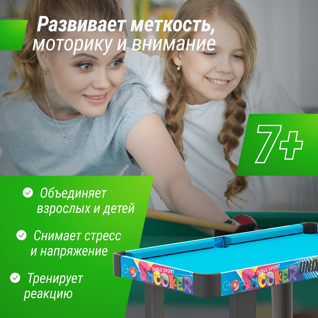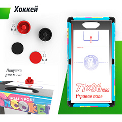 Аксессуары в комплекте | 2 кия, шары, треугольник, мел, 22 игрока, 2 мяча Ø 35мм, 2 страйкера, 2 шайбы, 2 ракетки, 2 мяча, сетка |