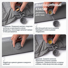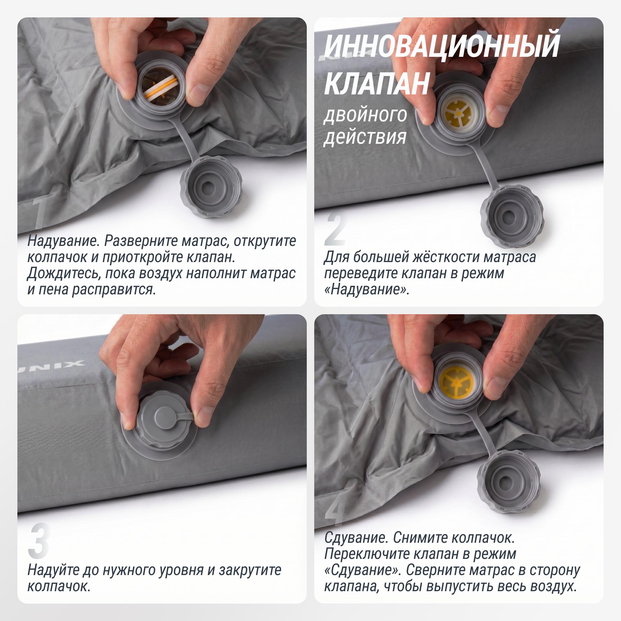 Забудьте о долгой подготовке к отдыху! Просто откройте клапан — и матрас наполнится воздухом за считанные минуты. Никакого насоса, никаких усилий. Благодаря инновационному клапану UNIX при скручивании матраса в процессе сдувания можно сделать паузу, если устали руки, при этом воздух не будет выходить наружу. Подходит для использования как в помещении, так и на природе. Надёжный клапан предотвращает утечку воздуха, а усиленные швы гарантируют долгий срок службы.