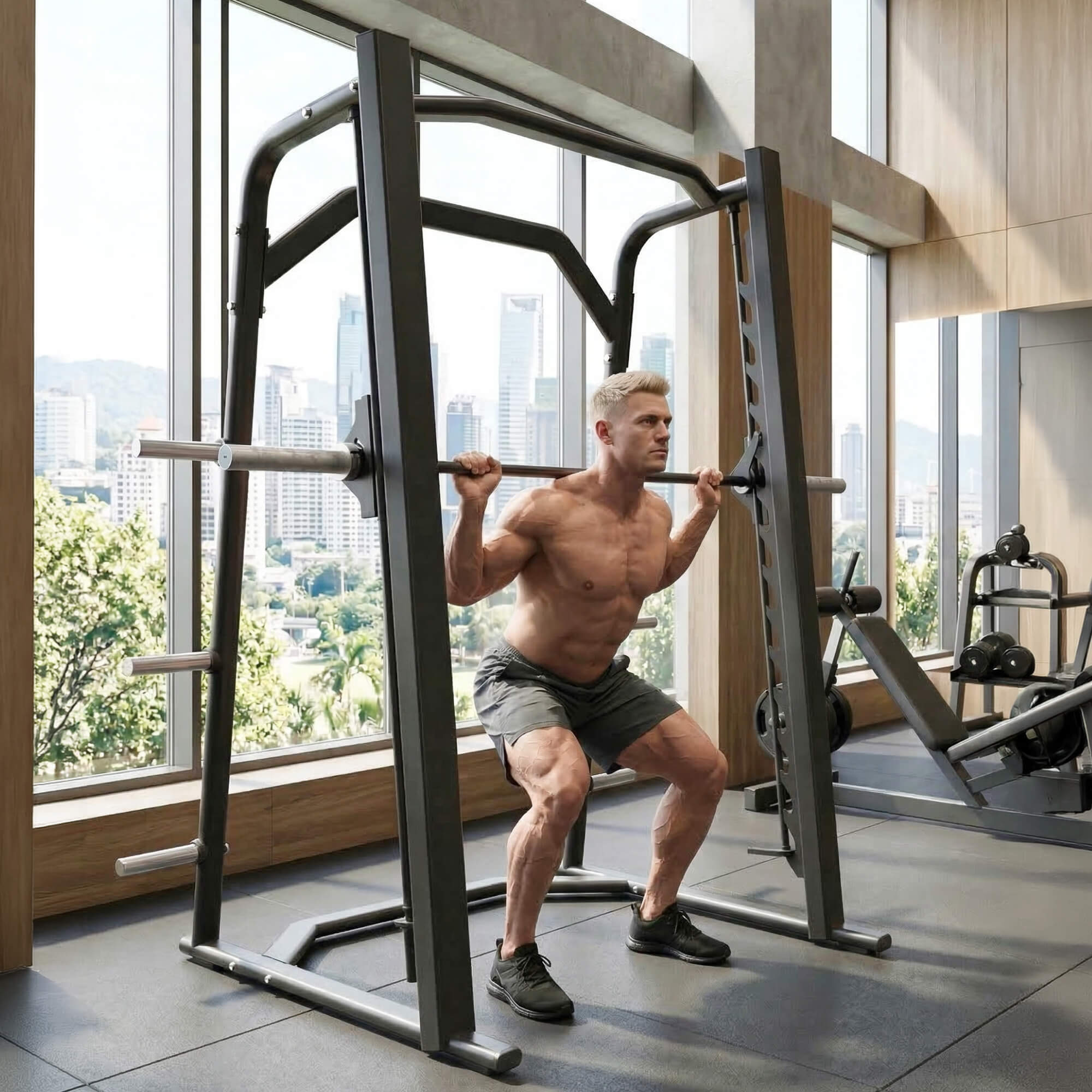- Конструкция выполнена из прочной стальной рамы, способной выдерживать значительные нагрузки. Это обеспечивает долговечность эксплуатации, безопасность при работе с тяжёлыми весами и устойчивость даже при интенсивных нагрузках.