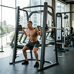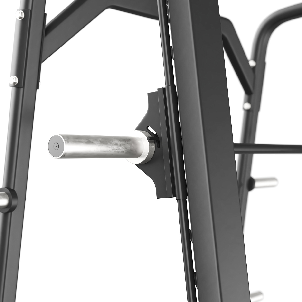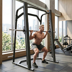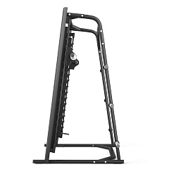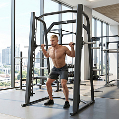 Одна из ключевых особенностей машины Смита 202 PRO заключается в возможности регулировки высоты штанги. Всего предусмотрено 15 различных положений грифа 213 см на страховочных крюках, что позволяет адаптировать тренажёр под рост пользователя и конкретные упражнения. Размер тренажера 220.9 х 127.2 х 231.7 см. Максимальная нагрузка 250 кг.