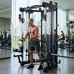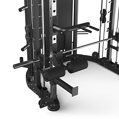 Габариты 196 × 147 × 223 см позволяют разместить оборудование даже в ограниченном пространстве зала. Силовая мультистанция объединяет сразу несколько функциональных позиций (рукояти для верхней и нежней тяги, гриф для штанги, турник, упоры для ног, упоры-брусья, упоры для жима ногами), каждая из которых предназначена для проработки определенных мышечных групп. Надежная стальная конструкция с усиленными сварными швами, профилем 50х80х3 мм гарантирует долговечность и устойчивость оборудования. Универсальный тренажер для тела позволяет эффективно задействовать практически каждую группу мышц. Для удобства тренировок модель оснащена 6-ю креплениями для хранения дисков 50 мм с нагрузкой до 75 кг каждый. Тренажер оснащен резиновыми подпятниками. Валики выполнены из вспененного полиуретана.