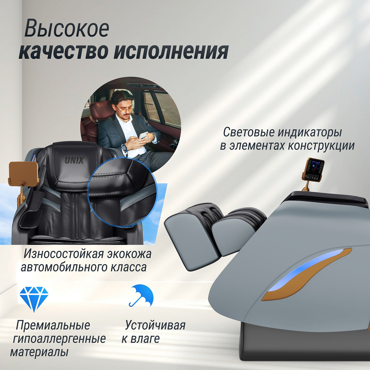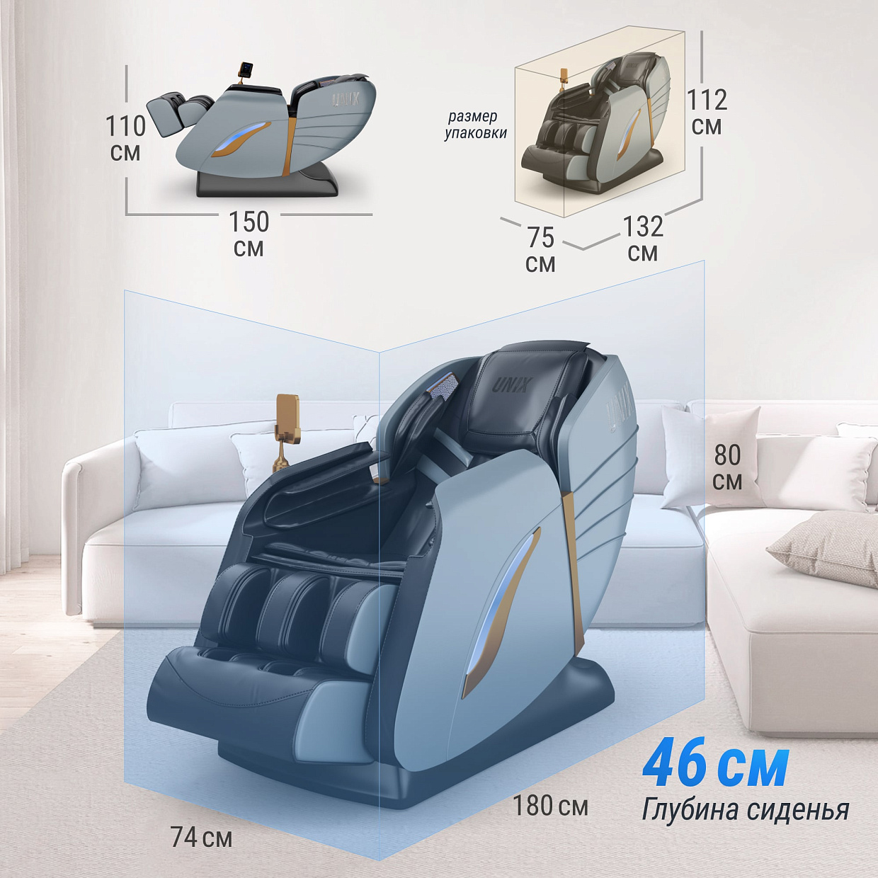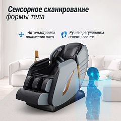 Регулировки и настройки | регулировка интенсивности: массажа на 3 уровнях, интенсивности давления воздуха на 3 уровня и времени на 3 уровнях; регулировка подъема голеней, подъема спинки, автоматическая регулировка угла наклона кресла в режиме Zero Gravity; подставка для голеней оснащена функцией телескопической регулировки, высота подножки определяется в зависимости от длины ног пользователя |