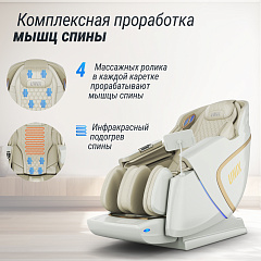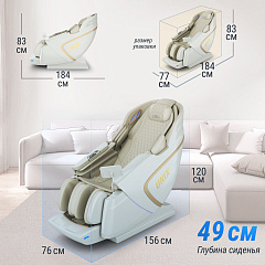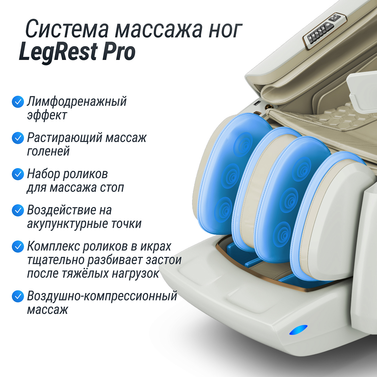 Функции | сканирование 3D по изгибам человеческого тела / система массажа с давлением на 360 градусов / определение индекса усталости / встроенный генератор отрицательных ионов кислорода / подогрев спины / анализ здоровья с измерением сердечных импульсов, пульсокиметр / слот для беспроводной зарядки и USB порт / функция массажа голеней с возможностью регулировки интенсивности в трех направлениях / функция массаж ступней и подошвы стоп / валик для ног / 2 массажные каретки / система массажа ног Legrest Pro |