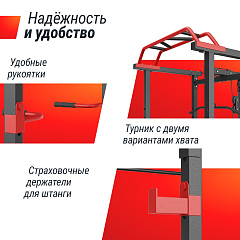 Интегрированный турник с мультихватом добавляет дополнительные возможности для разнообразия вашей тренировки, более того, она совместима с большинством типов тренировочных скамей (не входят в комплект), что позволяет осуществлять разнообразные упражнения, включая классический жим лежа. Вы сможете выполнять подтягивания в различных вариантах хвата, развивая верхнюю часть тела и спину. Удобные рукоятки обеспечивают удобный хват и стабильность во время выполнения упражнений.