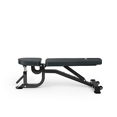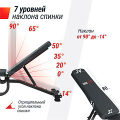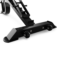 Универсальная скамья прекрасно впишется в домашнее пространство. Напольная конструкция не требует крепления к поверхности, а благодаря транспортировочным колесикам ее можно переместить в любое удобное вам место. Силовую скамью легко адаптировать в соответствии с фитнес-целями пользователя. Наклон спинки регулируется в 7-ти уровнях от 90 до -14°, что позволяет подобрать нужную позицию для тренировки. Возможно установить отрицательный угол наклона и проработать нижнюю часть грудных мышц. Размер спинки: 80 х 32/24 х 5,5 см.