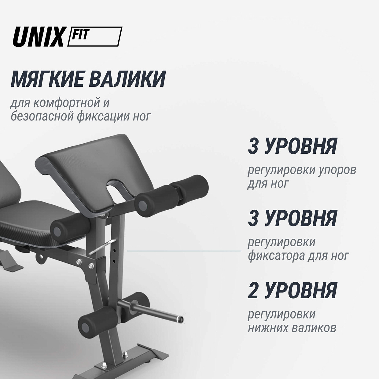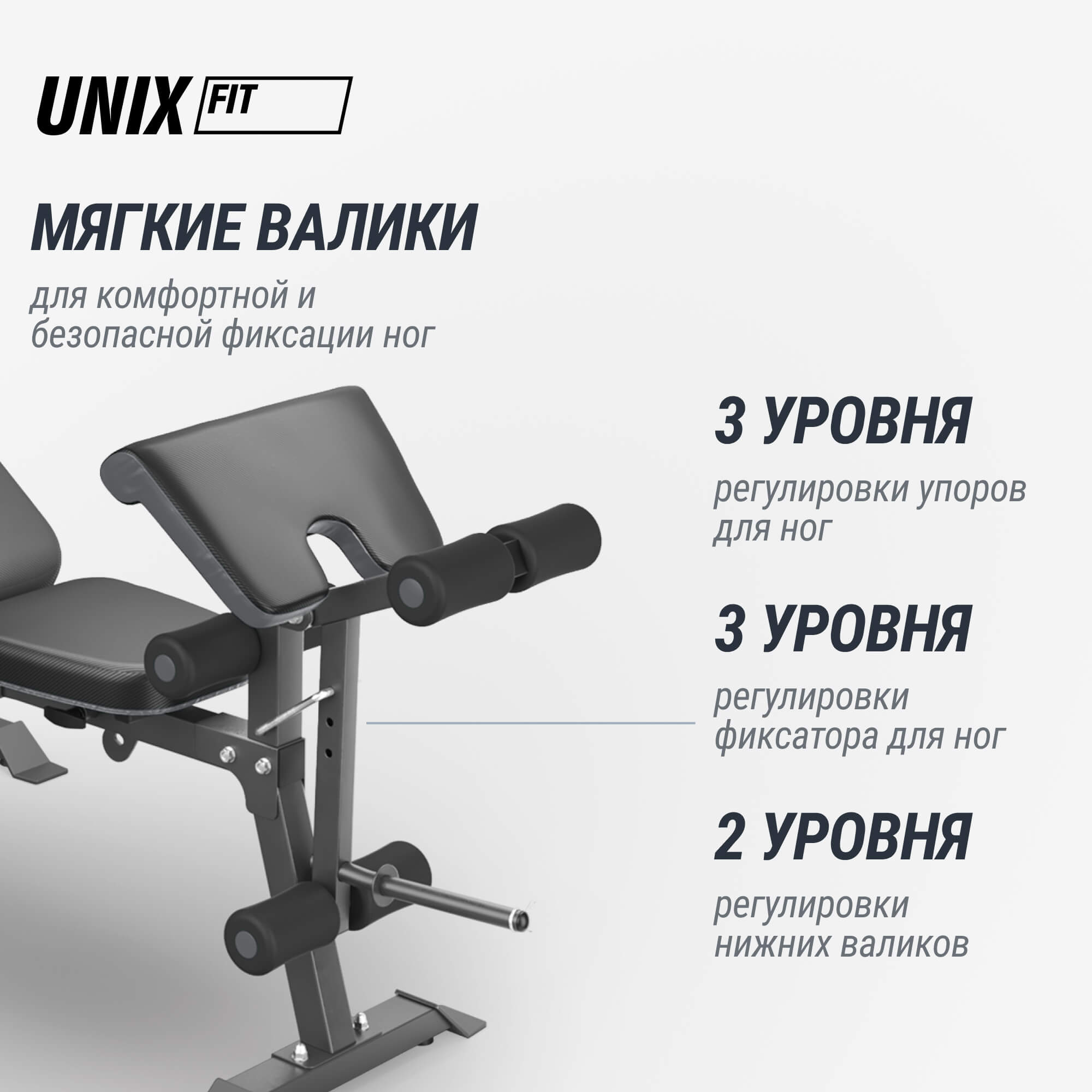 Регулируемые съемные валики разработаны специально для удобства выполнения изолированных упражнений на ноги и руки. Они помогают зафиксировать положение конечностей, обеспечивая дополнительную устойчивость и снижая нагрузку на суставы, что особенно важно при работе с большими весами. Валики легко снимаются и устанавливаются обратно, предоставляя гибкость в настройке скамьи под ваши потребности.