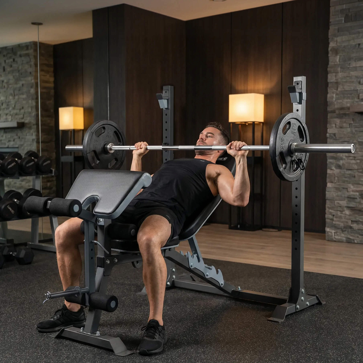 Изготовленная из усиленного стального профиля, спортивная скамья для фитнеса обладает высокой прочностью и устойчивостью. Регулируемые по высоте стойки для штанги имеют усиленные крепления, что гарантирует безопасность при выполнении упражнений с тяжелыми весами. Вы можете быть уверены, что тренировка пройдет без риска травм. Встроенные фиксаторы обеспечивают надежную поддержку штанги во время выполнения упражнений.