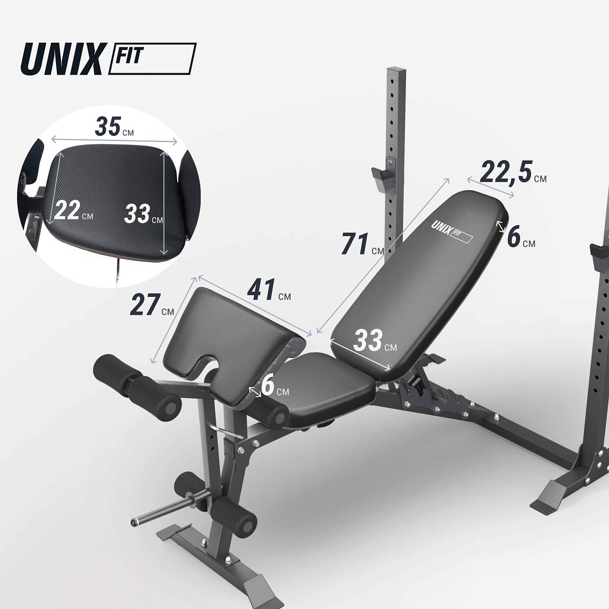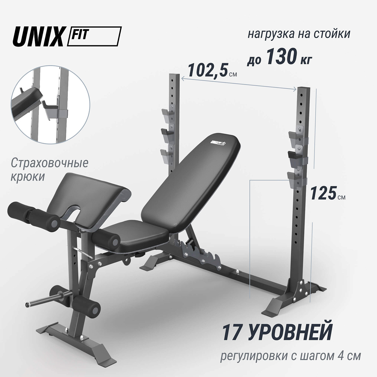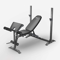 | Особенности | регулируемые стойки для штанги – 17 уровней с шагом 4 см, нагрузка на стойки 130 кг, стержень для дисков для увеличения нагрузки во время тренировки с посадочным диаметром 25 мм и замком-пружиной в комплекте, расстояние между стойками 102,5 см, съемные валики |