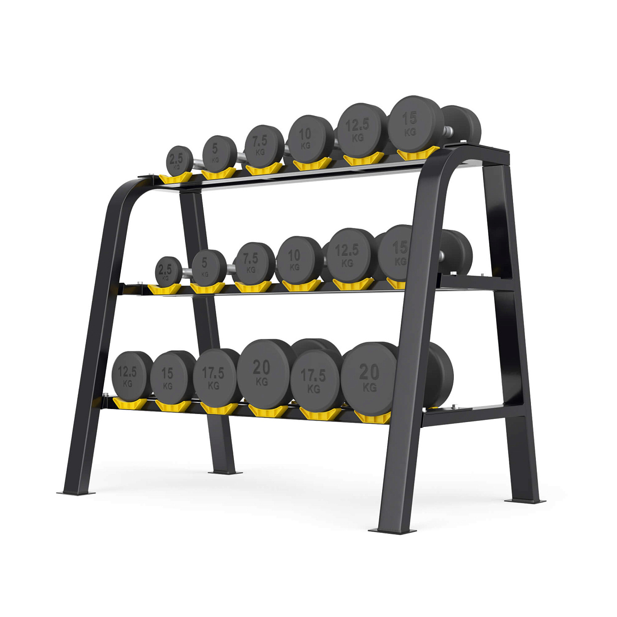 Подставка для гантелей изготовлена из особопрочной стали Q235, которая используется для производства деталей с большим уровнем нагрузки, например для строительства мостов и зданий. Такая конструкция с толщиной стали 1,8 мм обеспечивает надежное и безопасное хранение гантелей различного веса, защищая их от повреждений, сохраняя порядок в тренировочном пространстве. Трехрядная конструкция с противоскользящими ножками обеспечивает удобный доступ к гантелям во время тренировок.