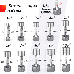 Комплектация | гантели: 1 кг - 2 шт, 2 кг - 2 шт, 3 кг - 2 шт, 4 кг - 2 шт, 5 кг - 2 шт, 6 кг - 2 шт, 7 кг - 2 шт, 8 кг - 2 шт, 9 кг - 2 шт, 10 кг - 2 шт |