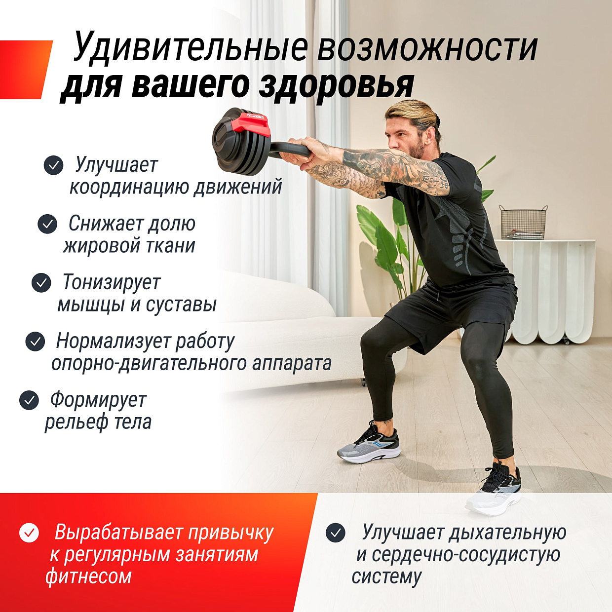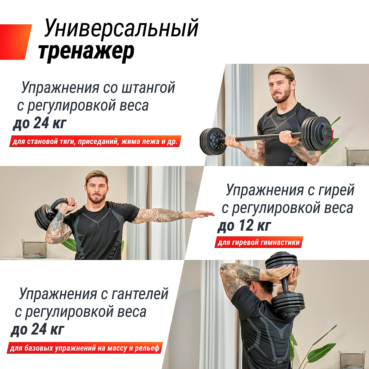 Разборная конструкция штанги легко трансформируется в набор - гирю и гантель. Сборная штанги с общим весом конструкции 24 кг является неотъемлемой частью тренировок с отягощением. С ее помощью вы сможете выполнять разнообразные упражнения, такие как приседания, жимы, становую тягу и многое другое. Спортивная штанга с блинами обеспечивает равномерное распределение нагрузки на мышцы, помогая вам развить силу и массу.