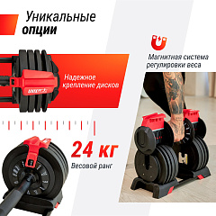 Предусмотрено 12 весовых вариаций (как в левой, так и в правой руке) для гантели: 3/6/8/9/11/13/15/17/18/19/21/24 кг.