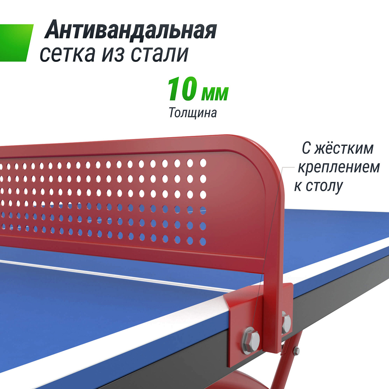 Антивандальная сетка с жестким креплением к столу изготовлена из стали толщиной 1 мм, толщина рамки составляет 10 мм. Благодаря этому, стол для пинг понга отлично подходит для эксплуатации как в частных домах и на дачах, так и в общественных местах, таких как парки, школы и кемпинги.