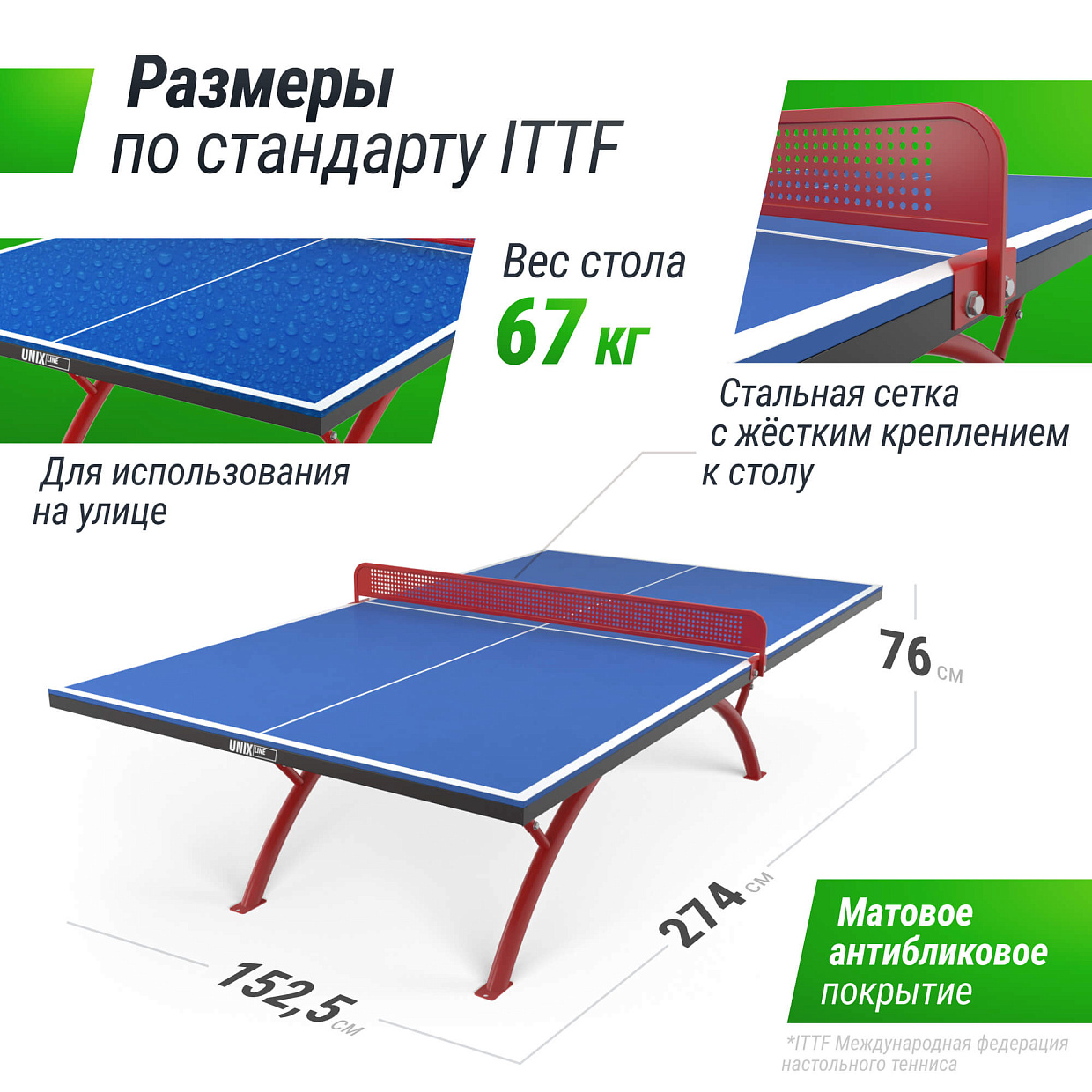 Антивандальный всепогодный стол для настольного тенниса UNIX Line 14 мм разработан специально для использования в парках, во дворах жилых домов, на даче, загородном участке, спортивной площадке на улице. Стол от UNIX Line - отличное решение для всех любителей настольного тенниса! Независимо от погоды или времени года, вы сможете наслаждаться спортивной игрой в теннис с друзьями и семьей!