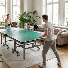 Теннисный стол оснащен системой блокировки в сложенном состоянии для повышения безопасности во время хранения и транспортировки в помещении.