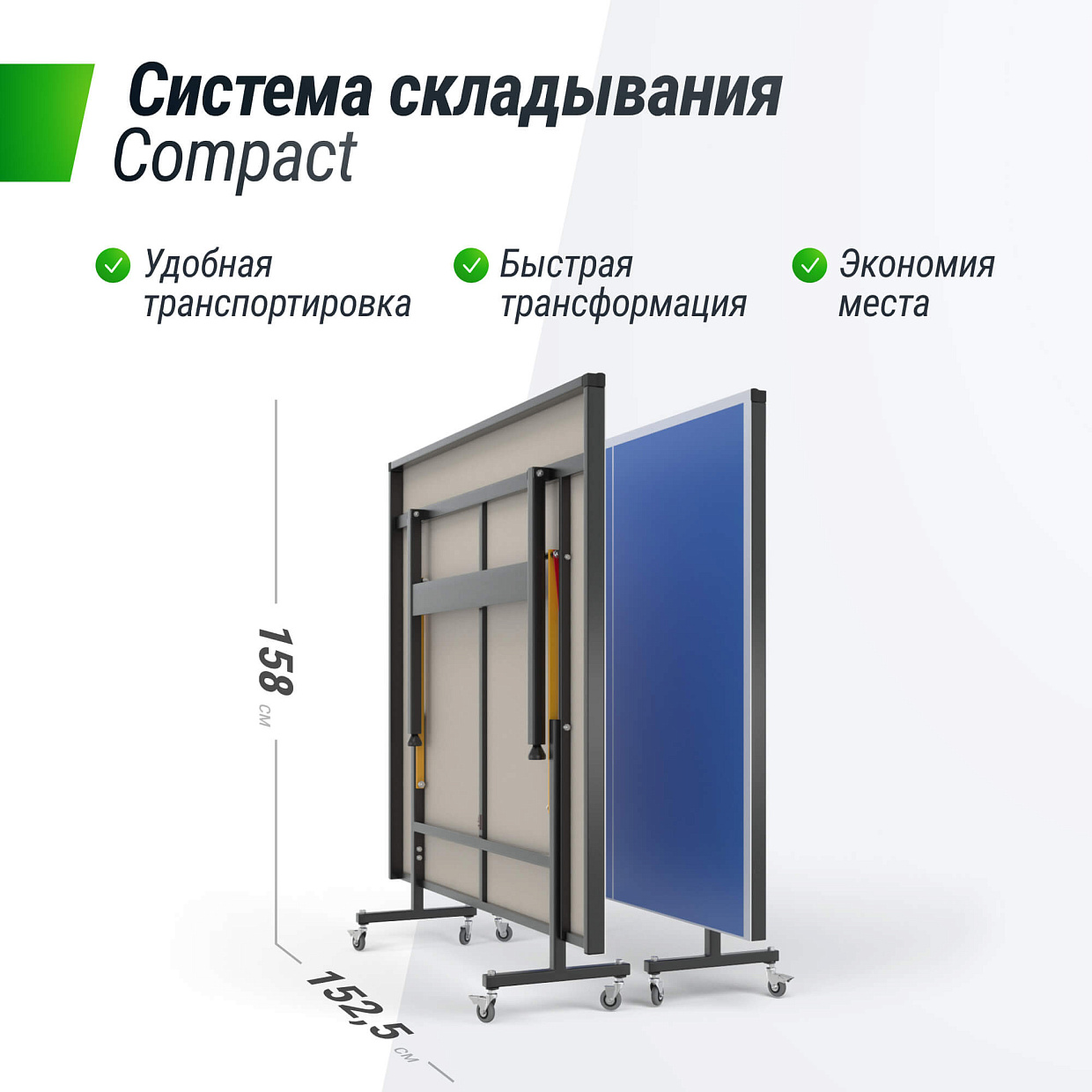Для комфортного перемещения теннисный стол имеет 8 колес диаметром 50 мм с подшипниками. Колеса оборудованы фиксаторами и обладают высокой износостойкостью.