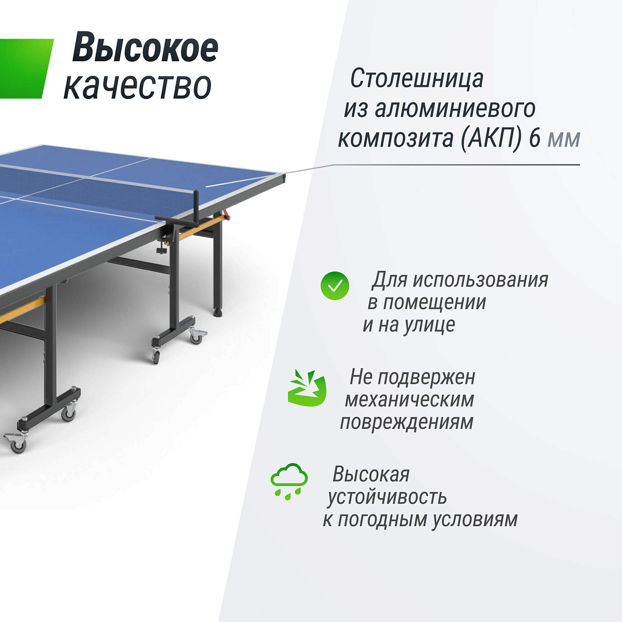 Столешница всепогодных столов UNIX Line изготовлена из композитной алюминиевой плиты с антибликовым покрытием, которая выдерживает самые экстремальные температурные нагрузки, не является горючим материалом, устойчива к осадкам, а также, за счет высокой плотности и толщины столешницы (6 мм), обеспечивается великолепный отскок мяча во время игры.