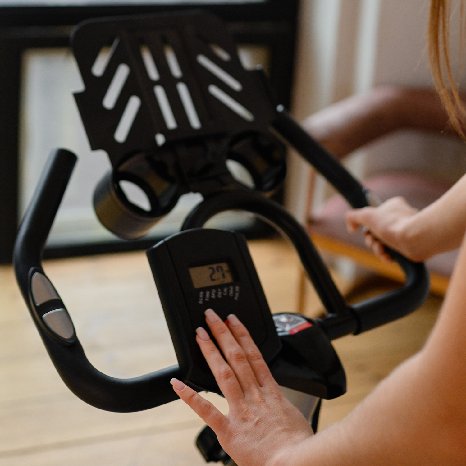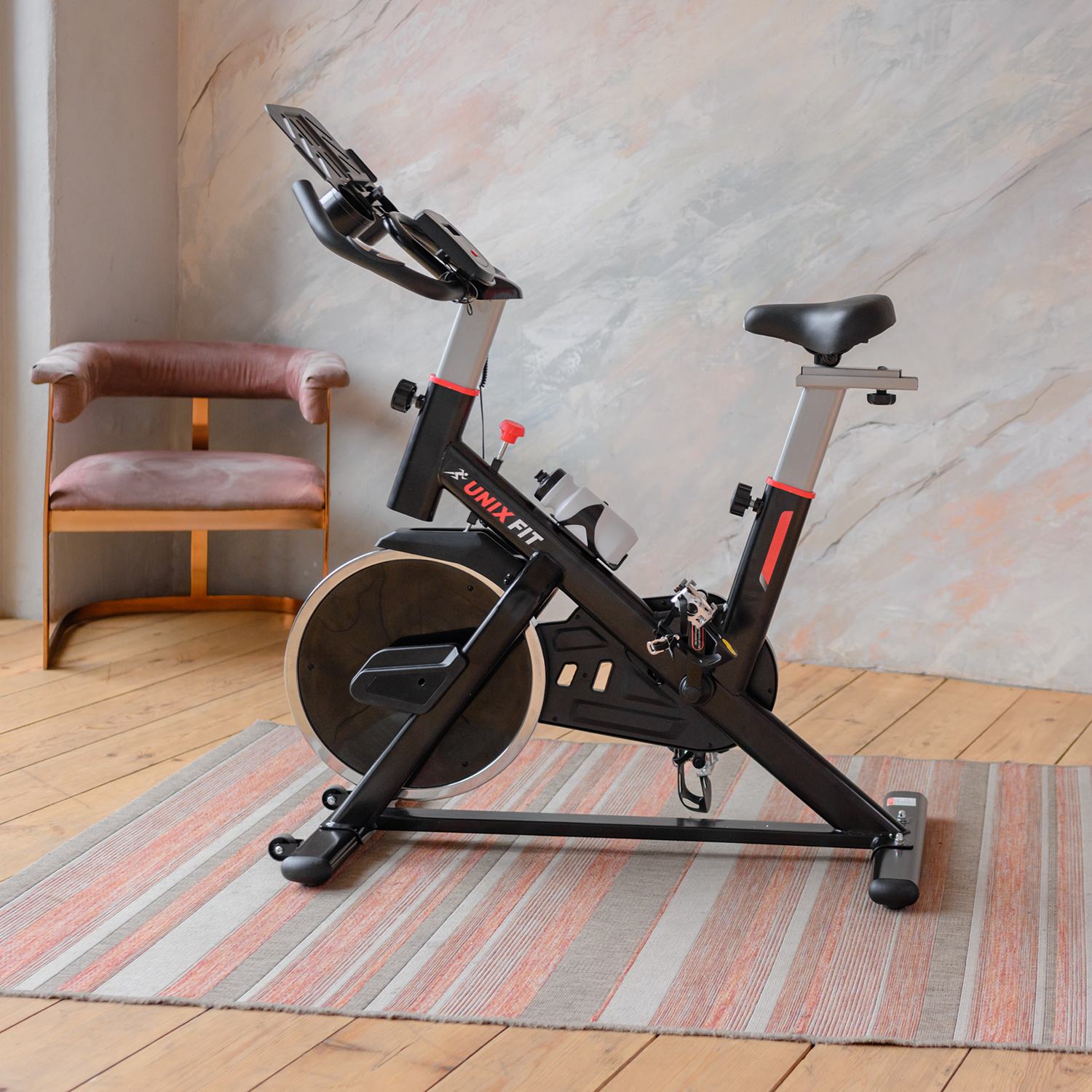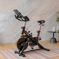 Спин-байк оснащен консолью с LCD-дисплеем, который отображает показатели времени, дистанции, пульса, калорий и скорости. Таким образом, пользователям будет легко получить максимум эффективности от тренировки. В комплекте специальная подставка под планшет или смартфон и пару держателей под бутылочку с водой.