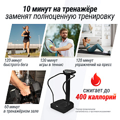 Консоль с 3-мя стикерами отображает всю необходимую информацию: время тренировки, скорость вибрации, а также кнопку запуска и остановки тренажера. Вибро платформа для похудения предлагает несколько режимов работы. Максимальный вес пользователя 150 кг. Ножки можно отрегулировать.