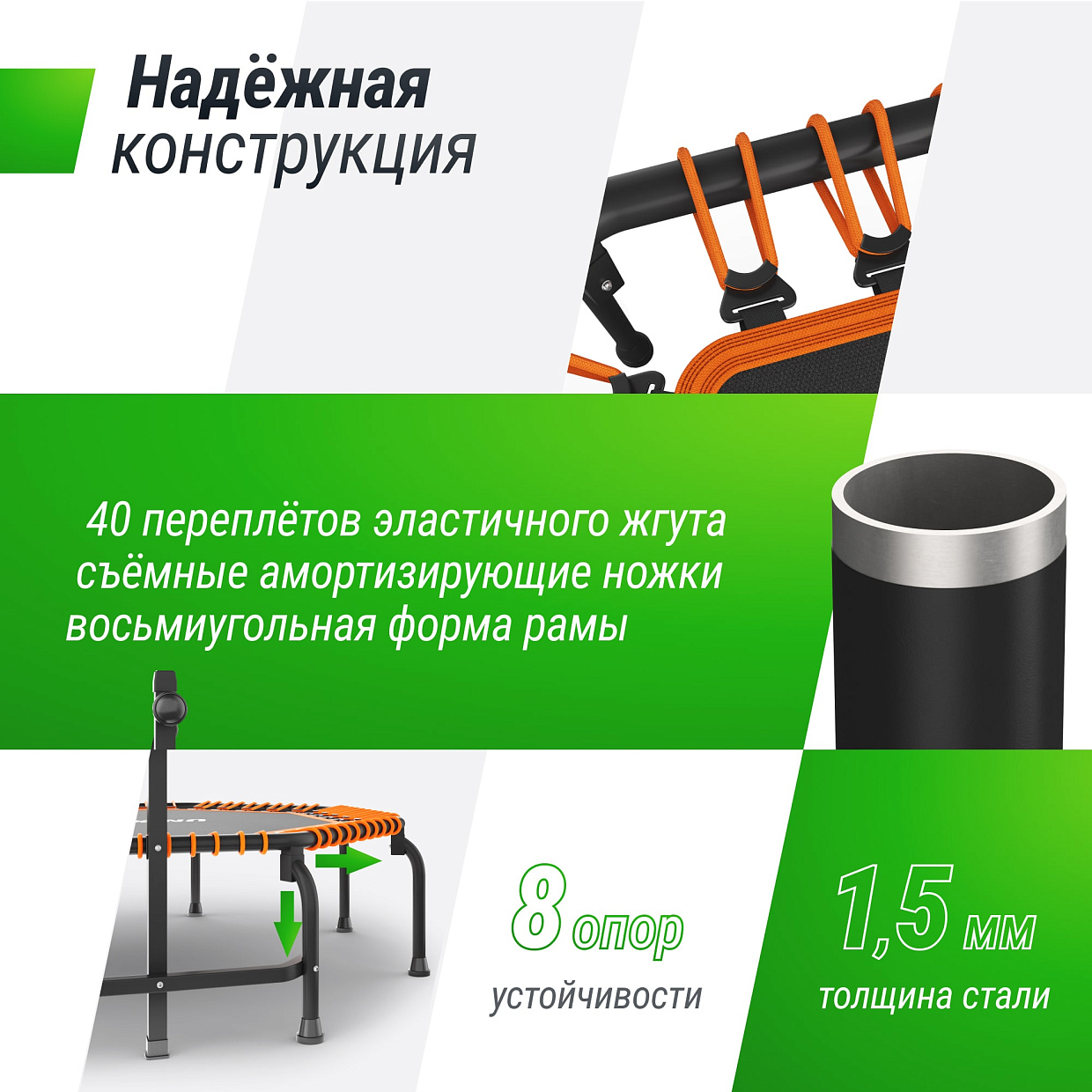 Данная модель батута разработана специально для занятий Джампингом (Jumping). Джампинг - это фитнес-программа и упражнения, которые выполняются на круглых батутах со специальными опорами. Это сочетание аэробной и силовой нагрузки, а также упражнения на баланс и растяжку. Упражнения на батуте помогают улучшить работу сердечно-сосудистой и лимфатической систем. Одно из основных преимуществ батута для фитнеса заключается в том, что он позволяет выполнять кардиотренировки без нагрузки на суставы, что делает его идеальным выбором для тех, у кого есть проблемы с суставами или травмы.