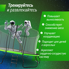 108 пружин, скрытых под накладкой, обеспечивают оптимальное натяжение полотна и отличный отскок! Широкое прыжковое полотно 488 см производится из специального высокопрочного материала Permatron, устойчивого к любым неблагоприятным воздействиям окружающей среды и механическим воздействиям. Permatron – эластичный материал, легко возвращающийся в исходное состояние при постоянном воздействии с разной нагрузкой. Он устойчив к внешним воздействиям: ультрафиолету, плесени, влаге, резким изменениям температуры. Термическая обработка делает эту ткань устойчивой к постоянным изгибам и стрессовым нагрузкам. Подходит для применения дома и на улице, этот материал не боится осадков и воздействия солнечных лучей, также обладает антисептическими свойствами. Максимально допустимый вес пользователя 150 кг. Размер прыжковой зоны: 433 см. Высота ножек: 89 см. Высота всего батута: 260 см.