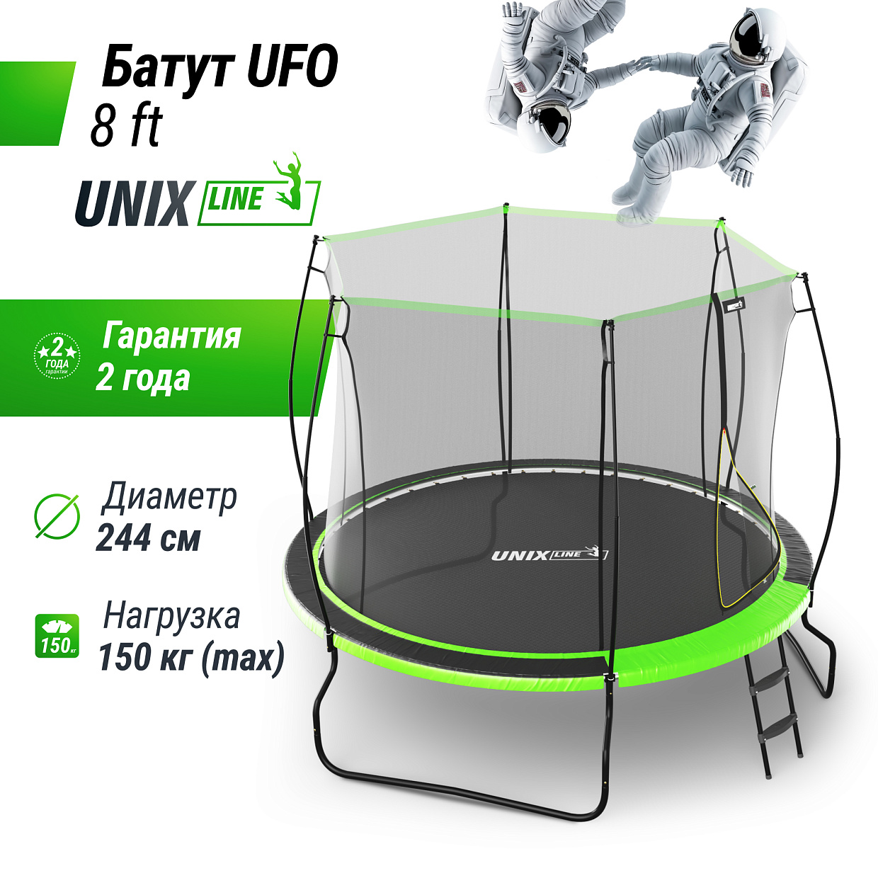 Большой батут также оснащен удобной лестницей для комфортного использования. Благодаря прочной конструкции и высококачественным материалам, каркасный батут для улицы способен выдерживать интенсивное использование и прослужит вам на протяжении многих лет! Позвольте себе и близким насладиться активным отдыхом, не беспокоясь о безопасности – с батутом UNIX Line UFO вы получите только положительные эмоции и яркие впечатления!
