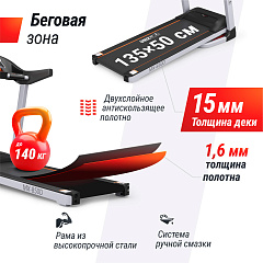 Двухслойное беговое полотно размером 135 х 50 см и толщиной 1,6 мм имеет антискользящее покрытие, что значительно увеличивает сцепление с поверхностью во время тренировок и способствует безопасности спортсмена. Дека толщиной 15 мм обладает отличным амортизационным эффектом, а благодаря 8-ми пружинным эластомерам с силиконовыми демпфирующими подушечками и 2-м суппортам нейтрализуется ударная нагрузка до 95% и снижается воздействие на позвоночник и суставы.
