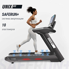 - Амортизация. Беговое полотно оборудовано современной ортопедической системой амортизации SAFERUN+. Ребристая поверхность бегового полотна и 10 встроенных эластомеров улучшают сцепление с кроссовками и делает тренировку более безопасной, если вы используете функцию наклона бегового полотна.