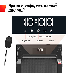 Двигатель мощностью 1.0 л.с. может развивать скорость от 1 до 8,5 км/ч с регулировкой шага 1 км/ч. Максимальный вес пользователя 90 кг. Пульт ДУ с кнопками "Start", "Stop", "Speed +" и "Speed –" в комплекте позволит в процессе тренировки на кардио тренажёре увеличить или уменьшить скорость, а также остановить или запустить дорожку.