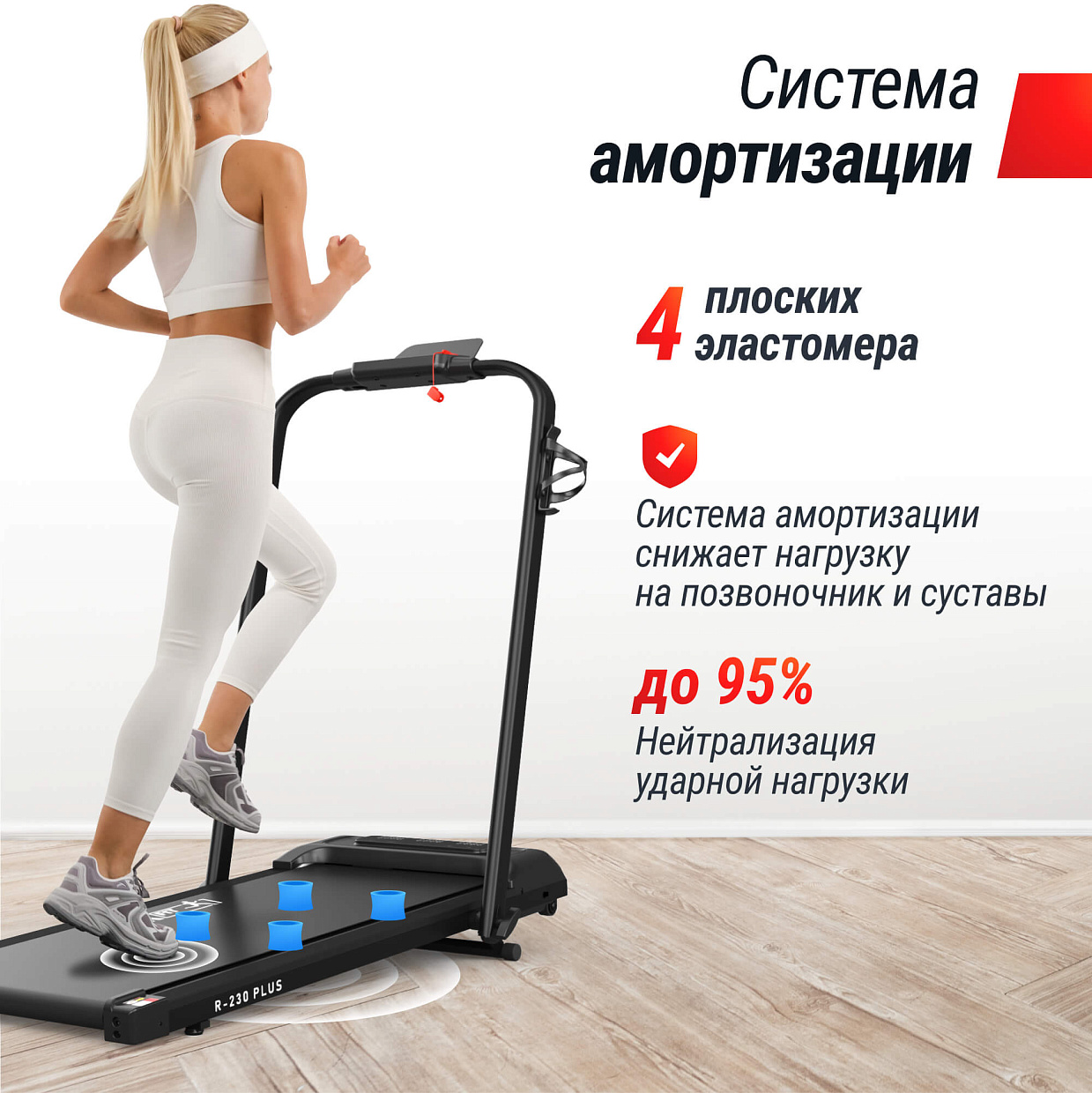 Система амортизации, состоящая из двух пружинных и четырёх плоских эластомеров, нейтрализует до 95% ударной нагрузки, защищая ваши колени и спину от травм и повреждений. Двухслойное антискользящее беговое полотно 105х40 см толщиной 1,4 мм и толстая алюминиевая дека обеспечивают долговечность и стабильность поверхности даже при длительных нагрузках, поддерживая вас на протяжении многих часов занятий. Допустимый вес пользователя 110 кг является достойным показателем для такой компактной модели, обеспечивая долговечность и надежность в использовании тренажера. Результаты тренировок не заставят себя долго ждать, ведь дорожка является отличным кардиотренажером для укрепления рук и ног, улучшения сердечно-сосудистой системы и повышения выносливости.