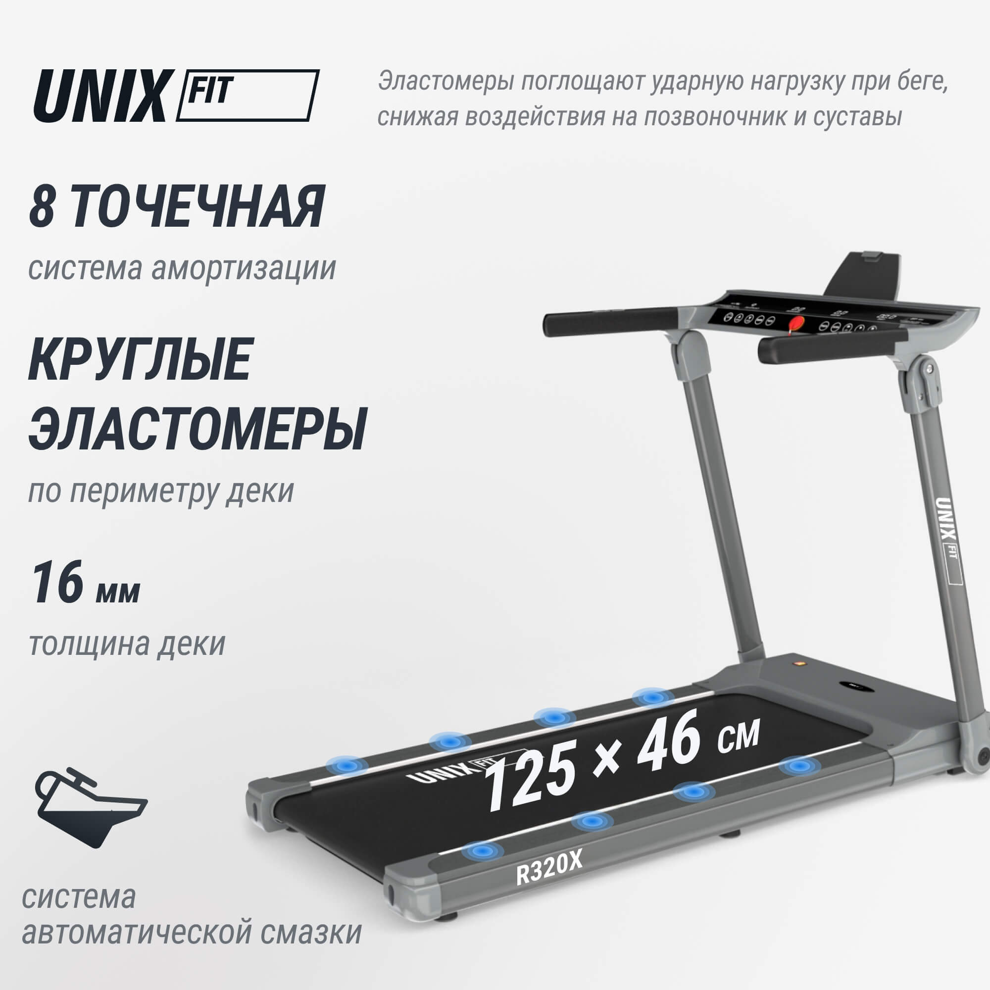 Особое внимание в домашней беговой дорожке R-320X уделено амортизации: 8 точечная система амортизации и круглые эластомеры по периметру деки эффективно снижают нагрузку на позвоночник и суставы, превращая каждую тренировку в комфортное и безопасное занятие. Полотно 125 x 46 см обеспечивает достаточное пространство для комфортной ходьбы и бега. Максимальная скорость 14 км/ч дает возможность варьировать интенсивность тренировки, а 12 встроенных программ, включая режим измерения ИМТ, быстрый старт и ручные настройки, делают занятия разнообразными и эффективными.