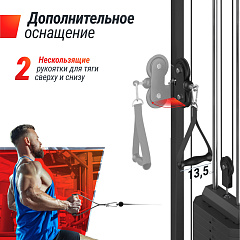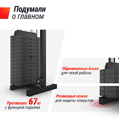 Ножки мультистанции обрезиненные для защиты напольного покрытия, а 2 нескользящие рукоятки для верхней и нижней тяги сделают хват очень надежным, защищая от скольжения и предотвращая появление мозолей. Кроссоверы позволяют выполнять широкий спектр упражнений на все основные группы мышц, такие как: грудные, спинные, плечевые, ягодичные и мышцы ног. Это делает спортивный комплекс универсальным инструментом для тренировки всего тела.