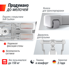 - Тренажер с автоматической регулировкой рамы до 21% оборудован эргономичными поручнями с датчиками пульса и противоскользящими широкими педалями с мягкими вставками, и оптимальной длиной шага 52 см, которые обеспечивают удобную и безопасную тренировку. Это позволяет задействовать большое количество мышечных групп - от бедер до ягодиц. Эллиптический тренажер может выдержать человека весом до 150 килограммов.