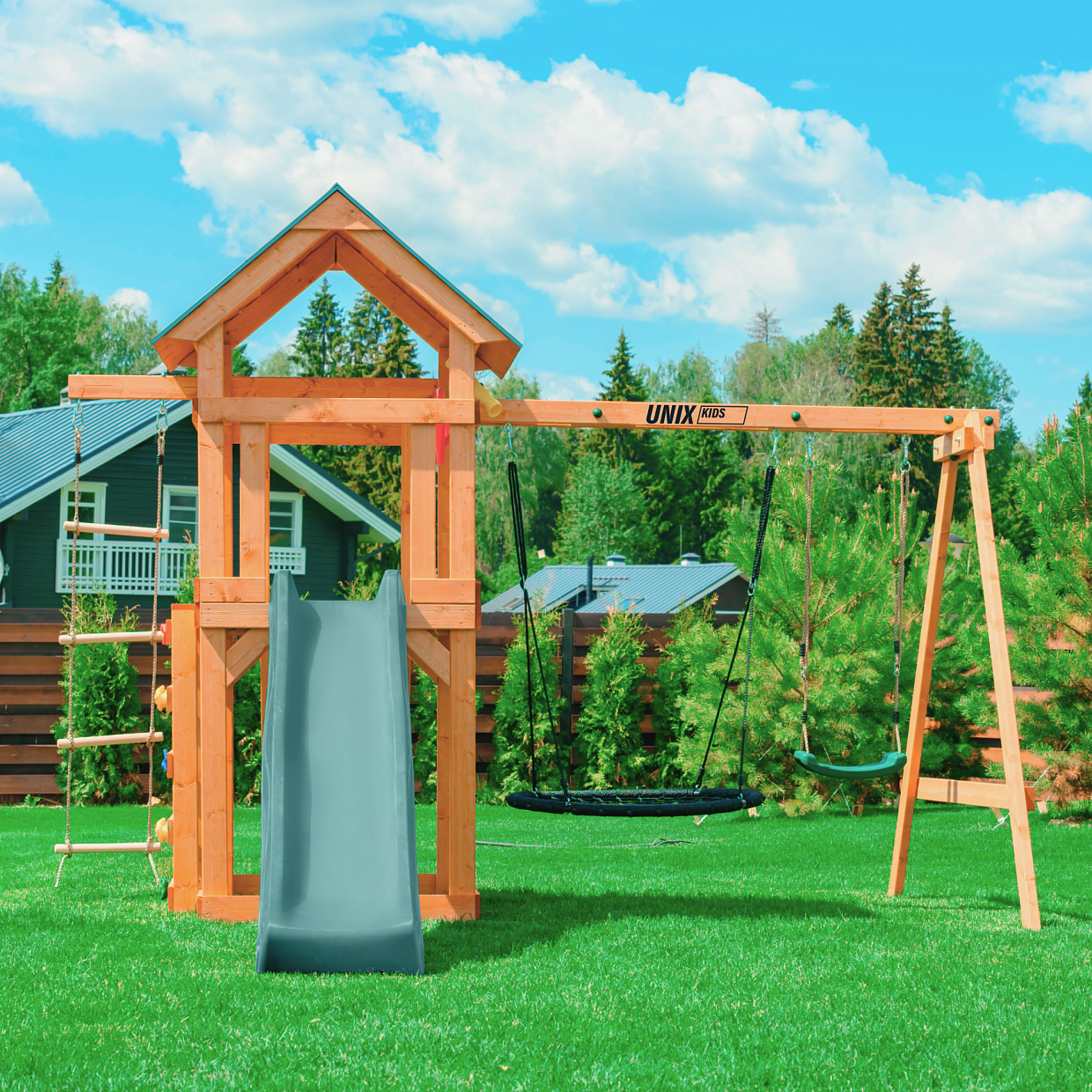 Игровой комплекс UNIX Line – это прекрасный подарок детям. Надежная игровая конструкция для улицы изготовлена из ангарской сосны. Предназначена для детей от 3-х лет.