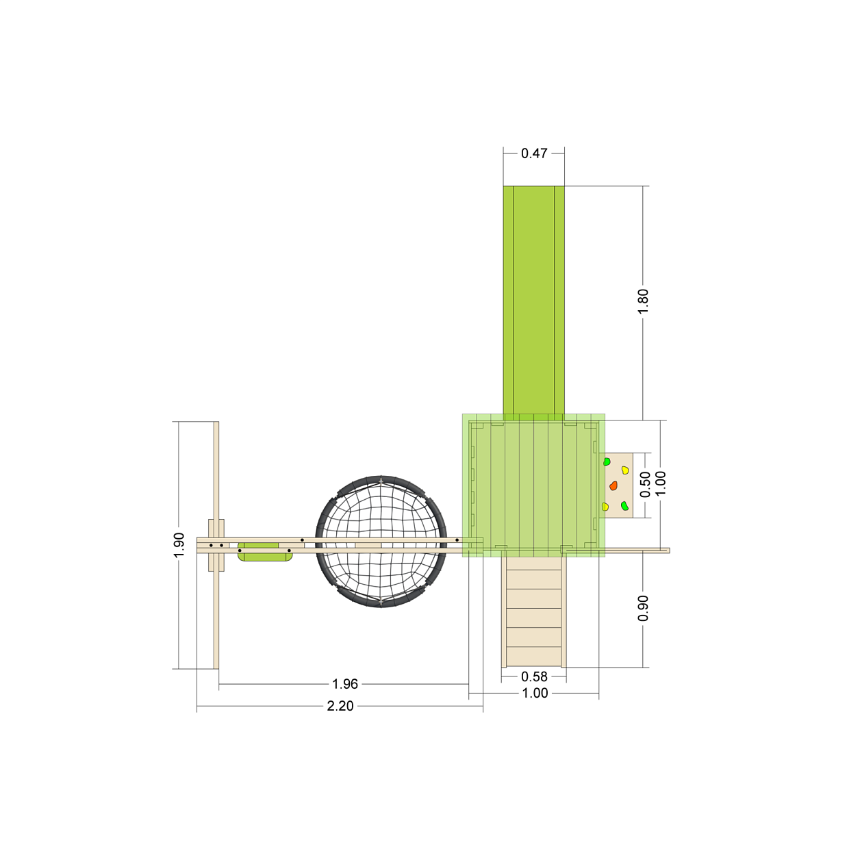 Детская площадка предназначена для установки на загородном участке в личное пользование. Конструкция не требует бетонирования каркасных стоек, устанавливается на подготовленную поверхность и держится за счет собственного веса. Под городок требуется участок поверхности размером 375 х 370 см.