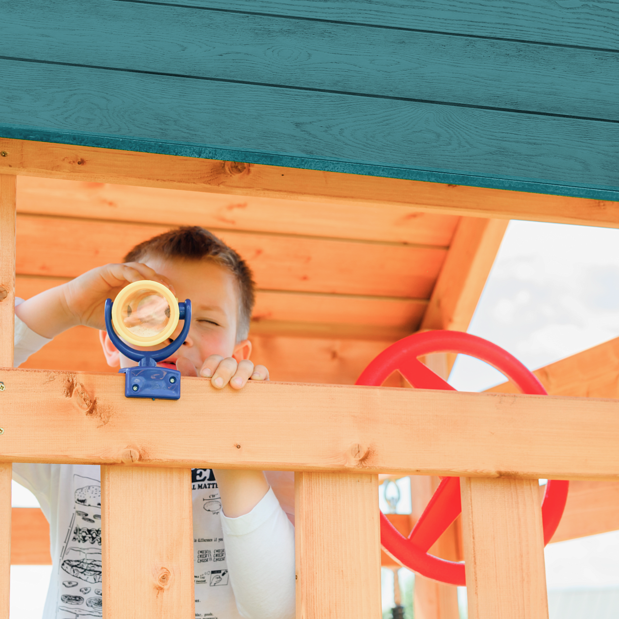 Основа городка – деревянная башня высотой 265 см. На высоте 115 см установлена игровая площадка с ограждениями. Сверху башню закрывает двускатная деревянная крыша. Нижний ярус башни можно использовать под небольшую песочницу.