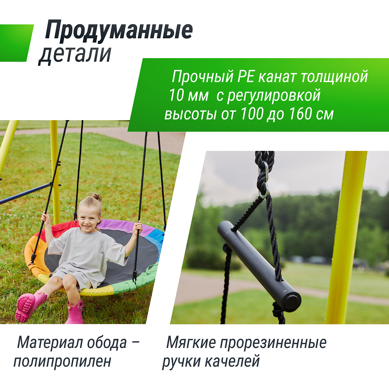 | Комплектация | Качели-гнездо, пластиковые качели, сетка футбольная, колышки, баскетбольное кольцо с сеткой, инструкция |