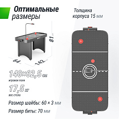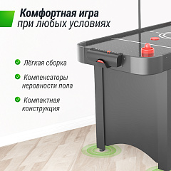 Большой игровой стол на ножках выполнен из МДФ с ПВХ ламинацией, что обеспечивает его долговечность и устойчивость к износу. Компенсаторы неровности пола гарантируют неподвижность стола даже во время самых напряженных партий. Столешница с ламинированным покрытием гарантирует отличное скольжение шайбы. 2 шайбы и 2 биты в комплекте позволят начать игру сразу после сборки стола!