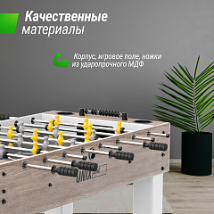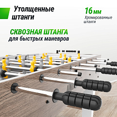 Игровой стол изготовлен из МДФ повышенной прочности, что обеспечивает его долговечность и устойчивость к интенсивным играм. Сквозная штанга из хромированного железа обеспечивает максимальную маневренность и легкость. Прочные и надежные элементы гарантируют, что настольный футбол прослужит долгие годы, сохраняя при этом отличные игровые характеристики.