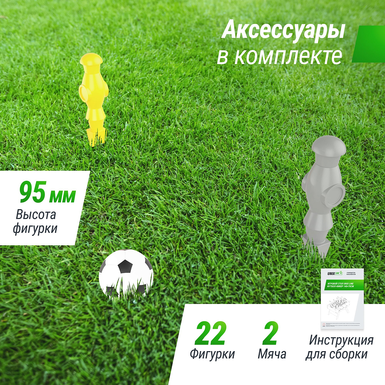 | Аксессуары в комплекте | 2 мяча Ø31мм, 22 игрока |