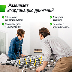 Стол имеет продуманную конструкцию, которая обеспечивает комфортную игру для пользователей любого роста. Удобные ручки и оптимальное расположение фигурок позволяют легко управлять игрой и делать точные передачи, создавая атмосферу настоящего футбольного матча. Настольная игра футбол оборудована механическим счетчиком очков.