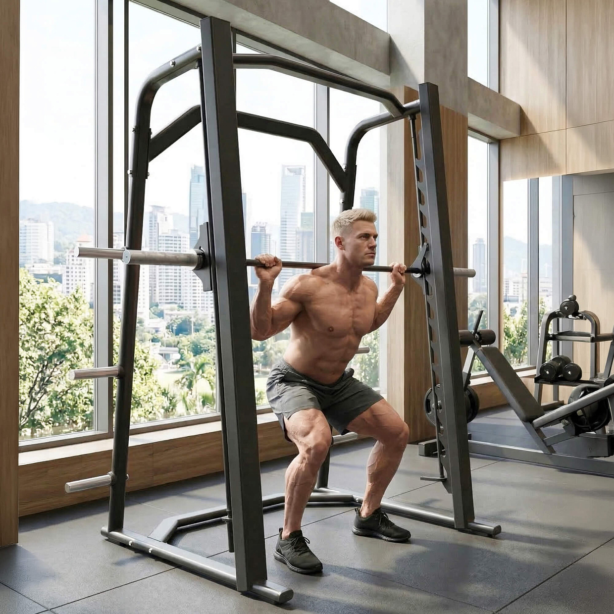 Одна из ключевых особенностей машины Смита 202 PRO заключается в возможности регулировки высоты штанги. Всего предусмотрено 15 различных положений грифа 213 см на страховочных крюках, что позволяет адаптировать тренажёр под рост пользователя и конкретные упражнения. Размер тренажера 220.9 х 127.2 х 231.7 см. Максимальная нагрузка 250 кг.